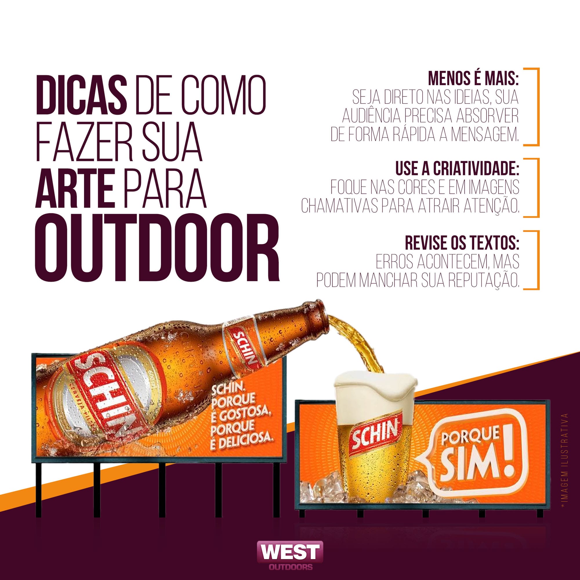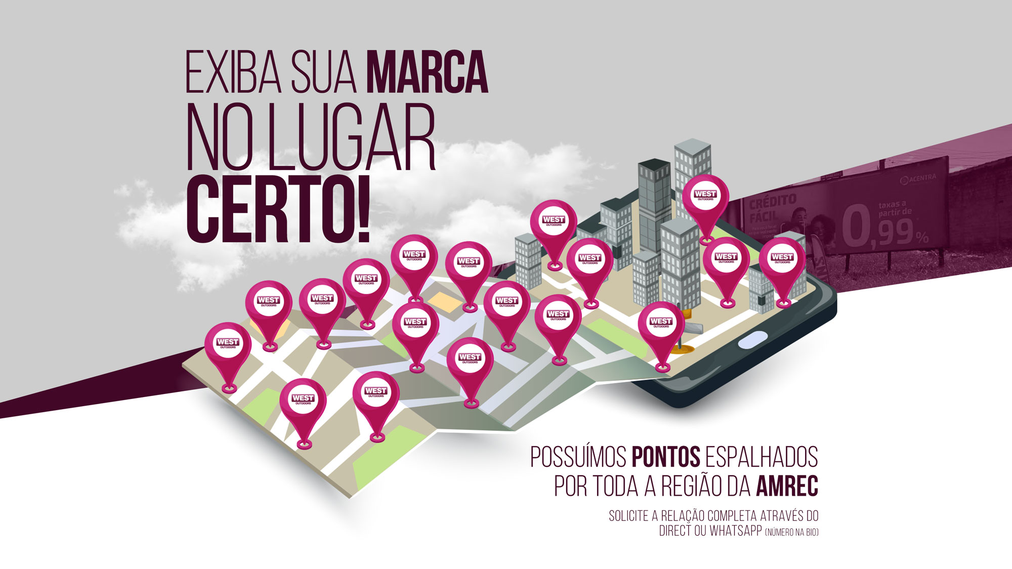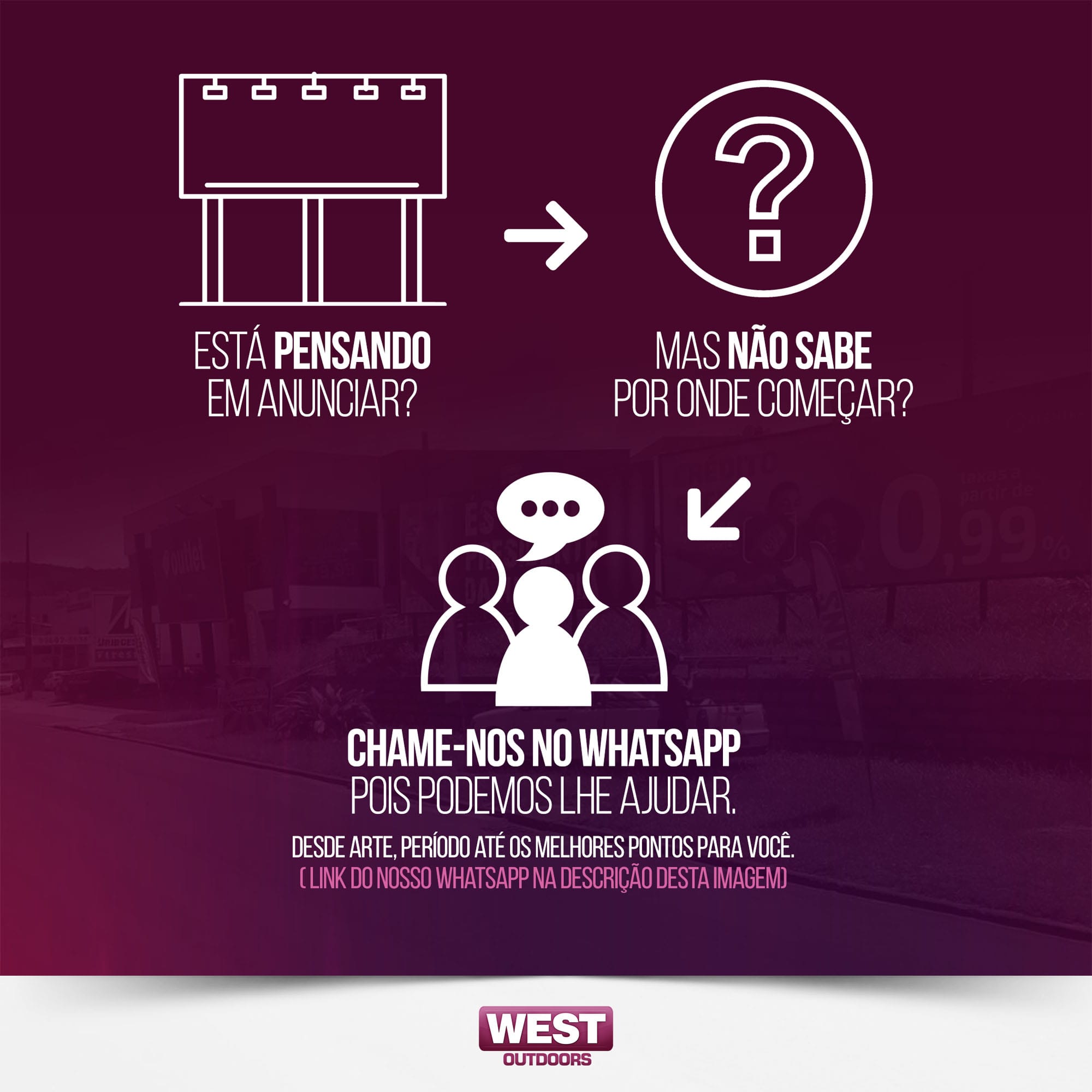 A West Outdoors é especializada em assessoria, planejamento e execução de mídia exterior com foco em campanhas de Outdoor em todo sul do Estado de Santa Catarina, tendo como objetivo o oferecer ótimas opções de mídia com soluções criativas, inovadoras e com alto grau de impacto visual de seus pontos.